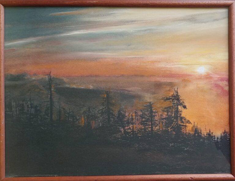 Západ slunce je nakreslen suchým pastelem, zarámován, fixativ